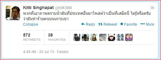 ผู้สื่อข่าวรายงานว่านายกิตติสิงหาปัด ผู้ประกาศข่าวชื่อดัง รายการข่าว 3 มิติ ได้ทวีตข้อความผ่านทวิตเตอร์ส่วนตัวอ้างถึงการนำเสนอภาพผิดพลาดของเฟซบุ๊กวิทยุไทยพีบีเอสด้วยโดยทวีตว่า"พวกที่เอาภาพคราบน้ำมันที่ประเทศอื่นมาโพสต์ว่าเป็นที่เสม็ดนี่ ไม่รู้หรือครับว่ามันทำร้ายคนบนเกาะเขา"