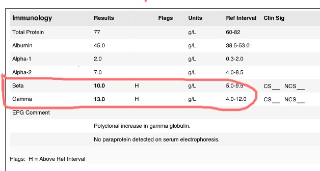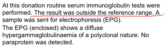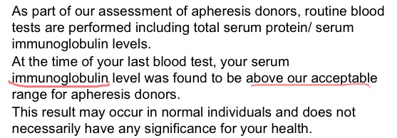 จดหมายฉบับแรกแจ้งมาว่า ผลเลือดแจ้งว่ามี อิมมูโนโกบูลินสูงกว่าค่าที่เค้า accept ซึ่งพอเปรียบเทียบกับ range ด้านหลัง เราคิด(เอาเอง) ว่าไม่ได้สูงมากเท่าไหร่ คงไม่เป็นไรมั้้ง ก็ไม่ได้กังวลใจอะไร