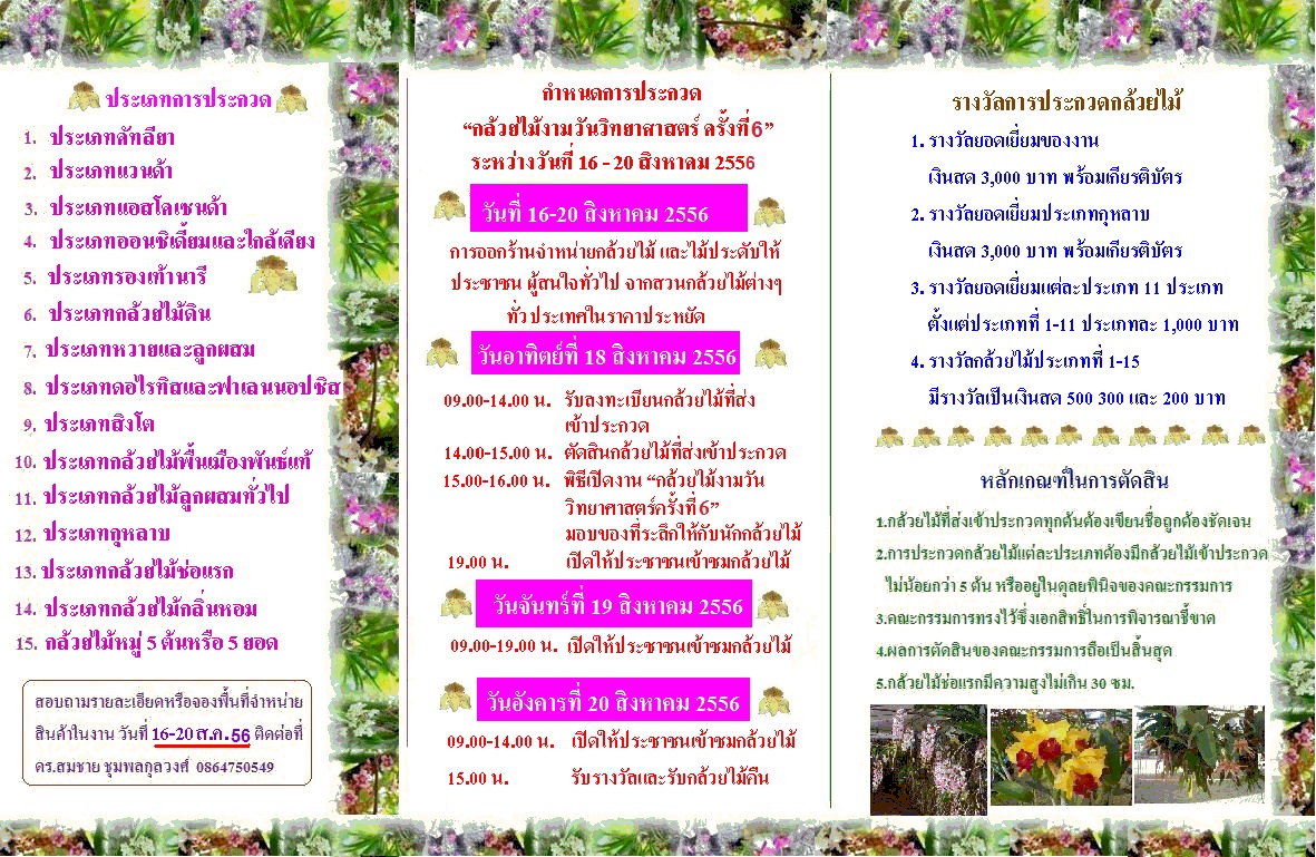 ขอเชิญท่านที่ชื่นชอบกล้วยไม้ร่วมงานประกวดกล้วยไม้ที่คณะวิทยาศาสตร์ มหาวิทยาลัยราชภัฎอุดรธานี รายละเอียดตามไฟล์ที่แนบมาครับ ขอบคุณครับ