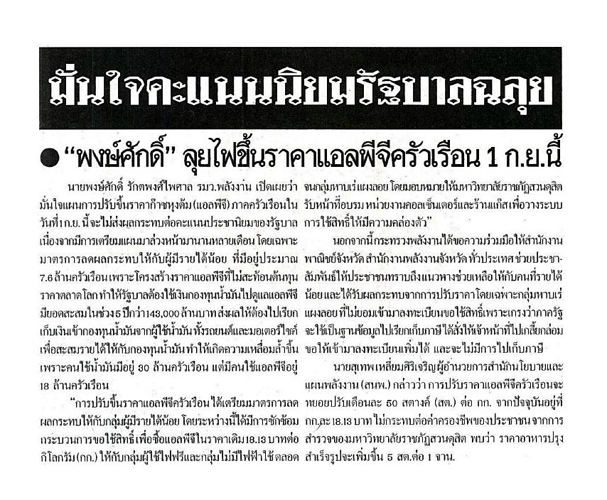 มั่นใจคะแนนนิยมรัฐบาลฉลุย "พงษ์ศักดิ์" ลุยไฟขึ้นราคาแอลพีจีครัวเรือน 1 ก.ย.นี้