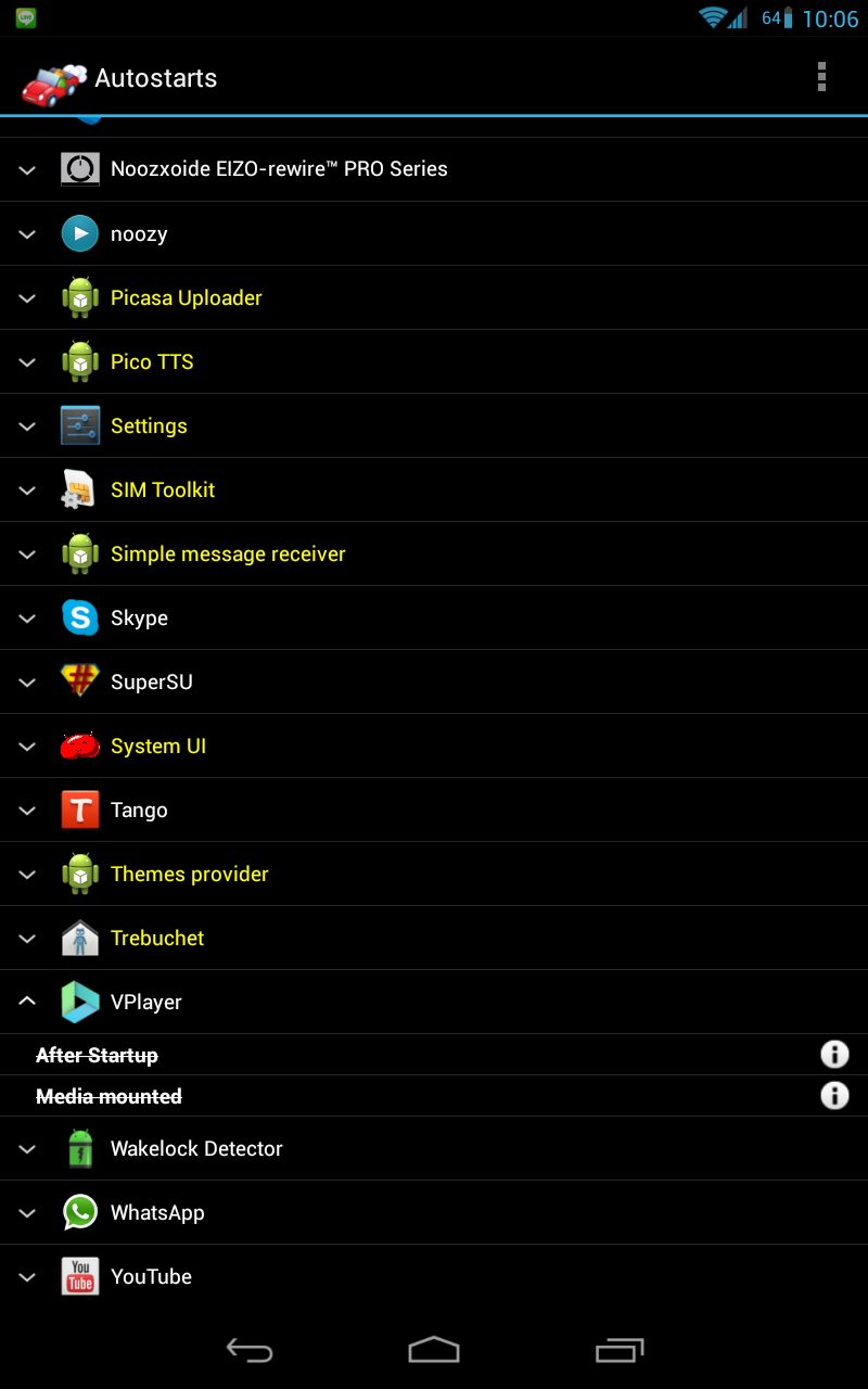 อย่างในรูป ผมเลือก disable app ที่ชื่อว่า vplayer (ไว้เล่นไฟล์วีดีโอ) หลังจาก startup ครับ