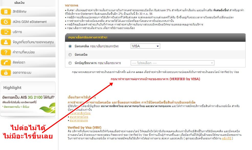 จ่าย e service ของ ais ไปต่อไม่ได้ เพราะอะไร ค้างตรง (( กรุณาทำรายการต่อจากหน้าจอของธนาคาร verified by visa ))