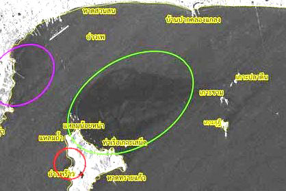 คราบน้ำมันที่ลอยเข้าอ่าวพร้าว(วงแดง)มันเล็กนิ๊ดเดียว เมื่อเทียบกับที่ลอยไปในทะเล(วงเขียว)