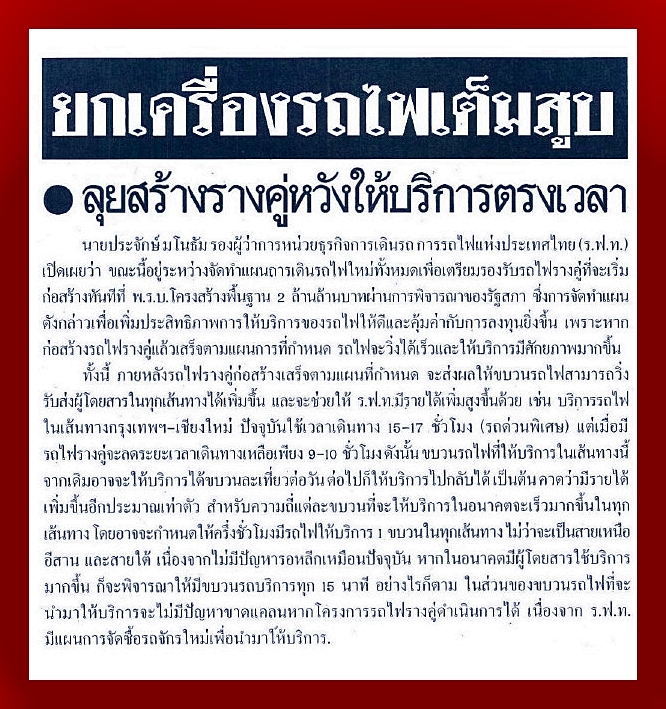 รถไฟไทยใช้สารพัดระบบราง 01/08/57 มติชน (กรอบบ่าย) ยุทธศาสตร์คมนาคมเร่งยิกตอกเข็มทางคู่ปี'58 31/07/57 ประชาชาติธุรกิจ เชื่อมรถไฟวิ่งจีน-มาเลย์ต่อรางเร็วสูงถึงปาดังเบซาร์ 31/