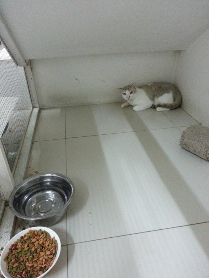 ติดระเบียงมาสองอาทิต(ผอมไม่มีอาหารกิน)เดินวนไปวนมาหาทางออกชั้นสองของระเบียห้างแต่ไม่มีทางออก(ไม่รู้ออกไปได้ไงถาม รปภ แม่บ้านโยนออกไปหรือเปล่าไม่แน่ใจเพราะเค้าบอกว่าเคยเห็นแมวมาเดินในห้างเลยจับไปทิ้งแต่ไม่รู้ทิ้งที่ไหน) ....จึงไปติดต่อกับทางห้างเพื่อให้จัดการจับน้องลงมา แต่ไม่เป็นผลทางห้างเมินเฉยค่ะ เราก็ไปที่นั้นทุกๆ3วัน(เป็นเวลาเกือบสองเดือน)เพื่อนำอาหารไปฝากให้กับน้องพนักงานร้านอาหารชื่อร้าน "เจเปนนิส" เพราะเป็นร้านเดียวที่สามารถเปิดระเบียงออกไปให้อาหารได้โชคดีที่ทางผู้จัดการ ชื่อ"คุณมิ๊กกี้"ใจดีมากยินดีให้พนักงาร้านเป็นธุระเรื่องวางอาหารให้แมวทุกวัน(แมวไม่คุ้นคนค่ะระแวงตลอดเหมือนโดนคนทำร้ายมาก่อนเลยกลัวคน...) จนเวลาผ่านไปก็ยังจับไม่ได้ ทางห้างออกหนังสือมาว่าห้ามให้อาหาร(น้องที่คอยให้อาหารแมวโทรมาแจ้ง)....จับก็ไม่จับให้...อาหารก็ห้ามให้ รู้ข่าวแล้วโมโหมากเลยมีคนแนะนำให้ไปแจ้งทางคุบิณฑได้ผลค่ะ.....คุณบิณฑส่งพี่ทีมงานร่วมกตัญญมาช่วย...(พี่ยอดนคร45 ช่วยสุดกำลังจิงๆ).สุดท้ายแมวใจเด็ดค่ะกระโดดลงจากระเบียงชั้นสองสูงมาก...ไม่ยอมให้จับวิ่งเข้าป่าเราก็กลัวจะบาดเจ็บทางพี่กู้ภัยก็ช่วยกับจับอย่างเต็มที่....ดีค่ะไม่บาดเจ็บ...แต่ขู่เป็นงูเลย....สภาพจิตใจแมวแย่มากๆ...ไม่ยอมออกจากกระเป๋าแมวเป็นอาทิตย์เพราะคงจะกลัวคน