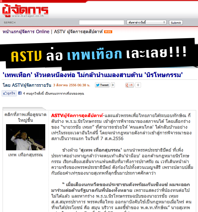 'เทพเทือก' หัวหดหนีลงท่อ ไม่กล้านำแมลงสาบต้าน 'นิรโทษกรรม' โดย ASTVผู้จัดการรายวัน