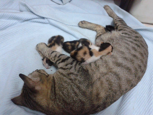 มาพักอยู่หอพัก แล้วมีแมวมานอนป่วยอยู่หลังห้อง เลยช่วยรักษาจนหาย แล้วมันก็ไม่ไปไหนอีกเลย ทีแรกคิดว่าจะพาไปทำหมัน แต่สงสัยว่ามันน่าจะท้องอ่อนๆ เลยรอเวลา แล้วก็ท้องจริงๆ จนเมื่อคริสต์มาสที่ผ่านมามันก็คลอ