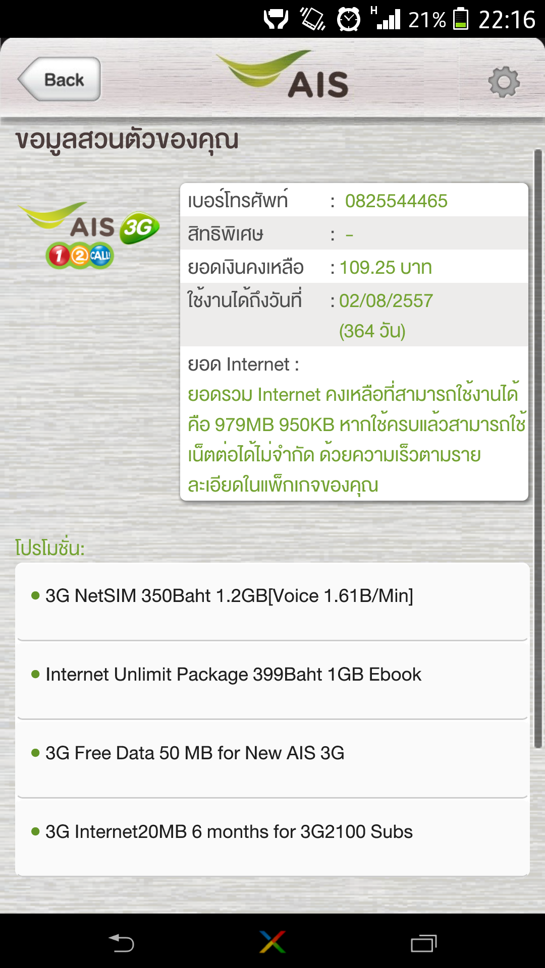 โปรเดิมผมนึกว่ามันเป็นอันลิมิต จะเปลี่ยนเป็น Internet 3G2100 Package แบบรายเดือน Package AIS 3G 2100MHz 1 GB 399 บาท/เดือน (+vat=426.93) ใช้ 3G 2100MHz 1 GB ต่อเดือนส่วนเกินจาก 1 GB เล่นเน็ตได้ไม่อั้