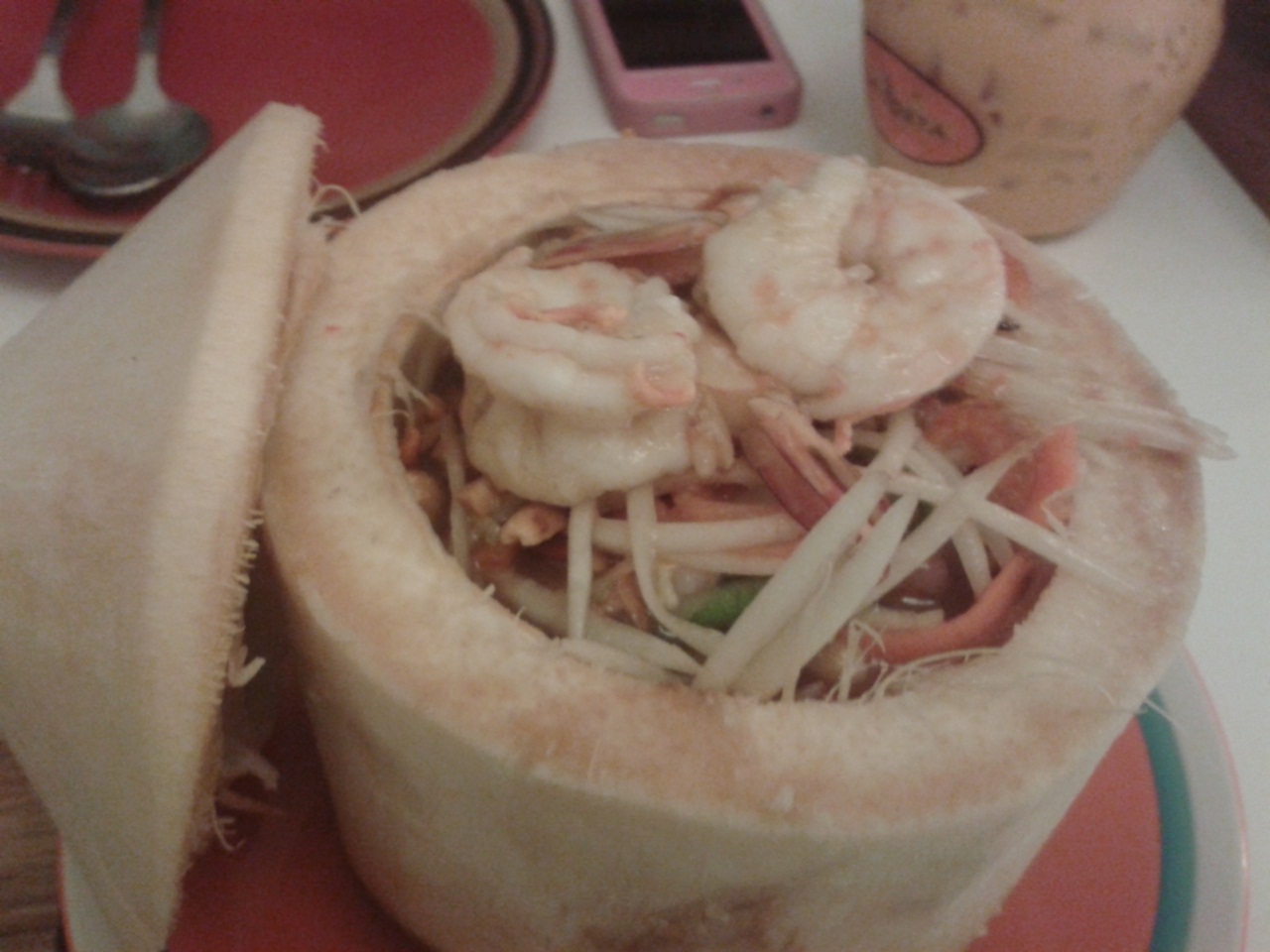 จานที่สาม ส้มตำมะพร้าวอ่อนในลูกมะพร้าว มีกุ้ง หอยแครง มะพร้าวอ่อน ไม่เผ็ดมาก ใช้ได้ค่ะ แต่สมาชิกบอกว่าเผ็ด เอ๊ะ ยังไง