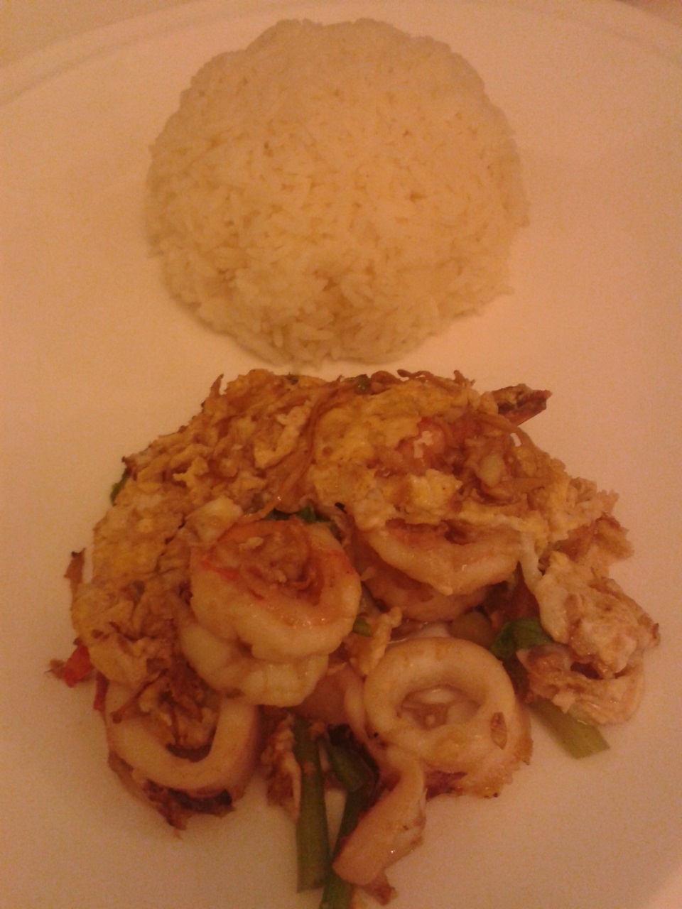 จานที่แปด ข้าวแห้งคุณยาย จานนี้ประทับใจเราที่สุดเลยค่ะ เป็นข้าวปรุงคล้ายข้าวต้มแต่ไม่ใส่น้ำซุป มีกุ้ง หมึก ปลาผัดมากับไข่ คึ่นช่าย อันนี้จำราคาได้ 89 บาท