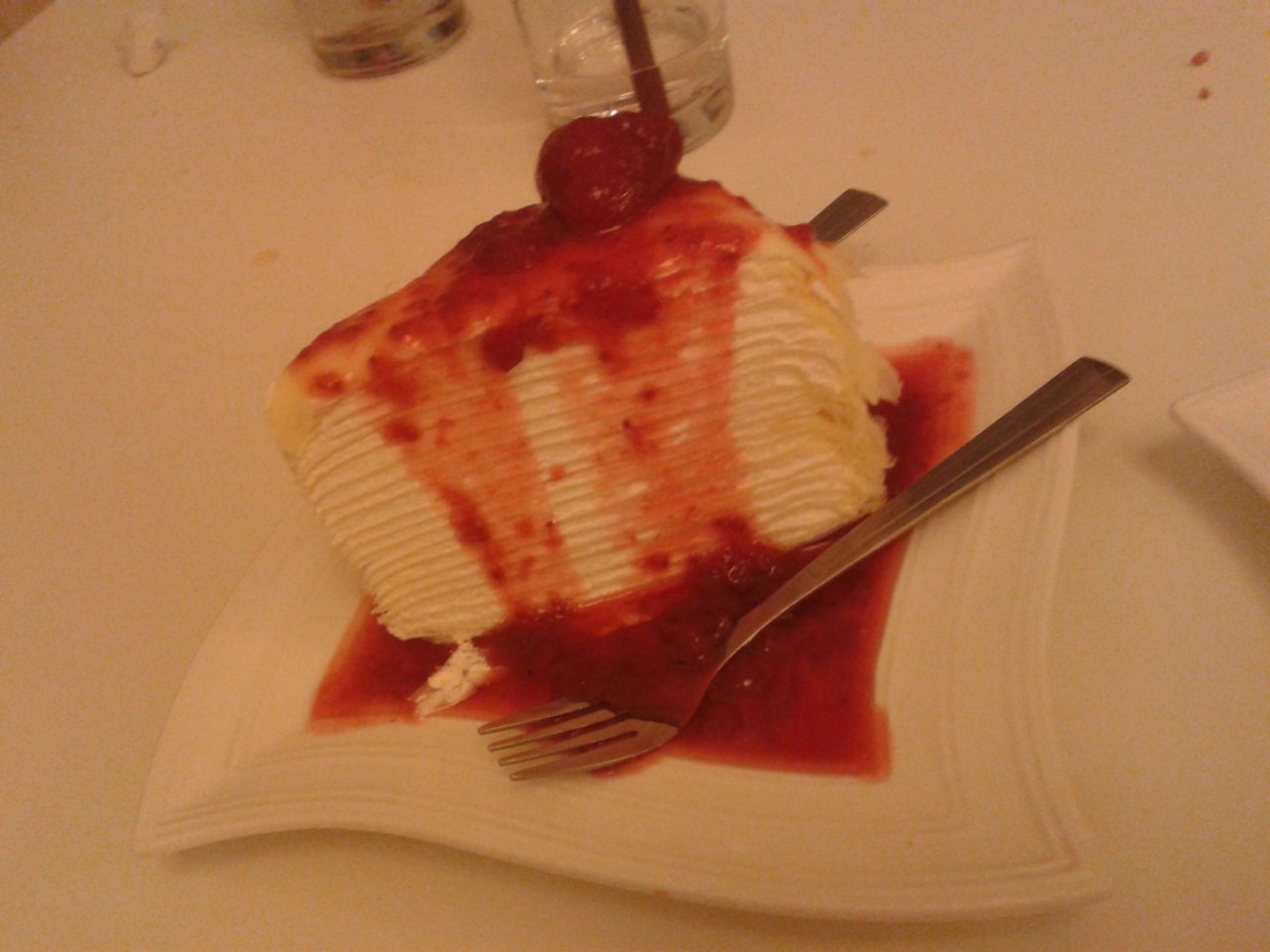 สุดท้ายแล้ว เครปเค้ก เราชอบสุดในบรรดาสามจานเพราะมีรสเปรี้ยวมาตัดทำให้ไม่เลี่ยน แต่สมาชิกบอกยังรสชาติยังสู้ที่บ้านต้นเค้กไม่ได้นะคะ