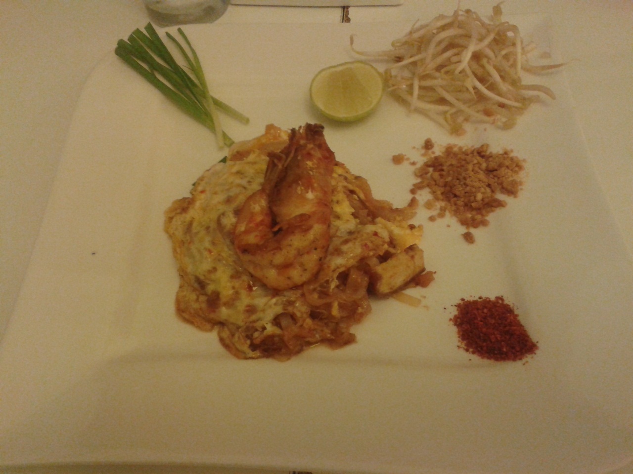 อาหารจานแรกมาแล้ว ผัดไทยกุ้งแม่น้ำ รสชาติดีค่ะ อร่อย