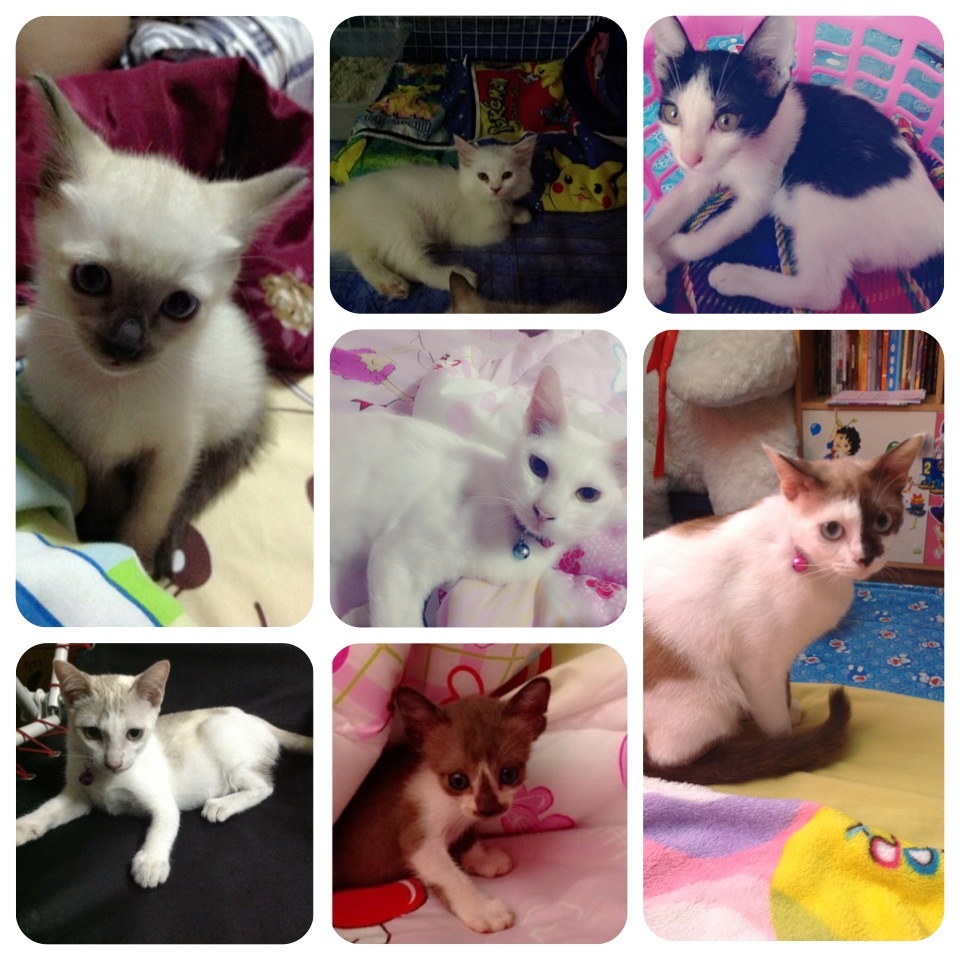 เมื่อก่อนไม่เคยคิดที่จะเลี้ยง อยู่ๆก็มีน้องแมวเดินผ่านมาหน้าบ้าน ตัวผอม ขี้ตากัง เลยอุ้มเข้าบ้าน กะว่าจะเลี้ยงพอโตหน่อย ก็จะปล่อยไป แต่ยิ่งเลี้ยง ยิ่งรัก มีตัวแรก ก้อมีตัวสอง ตัวที่สอง เห็นที่วัด เลยขอหลวงตามา ตัวที่สามนี่สิ ไปซื้ออาหารแมวที่ร้านคุณหมอ คุณหมอบอกให้เอากลับไปด้วยสงสารมัน ตัวที่ สี่กับ ห้า เห็นประกาศในเวปแล้วถูกชะตา เป็นแมวโต ท้องแก่ น้องน่ารักมาก เข้ากับคนง่าย ตัวที่ หก สามีอุ้มมาจากโรงงาน เพราะสงสาร ตัวที่ เจ็ด สามีพาไปซื้อมาจากศรีราชา ซื้อปลอบใจที่แม่แมวแท้งลูก ตัวที่ แปด กับ เก้า สามีเห็นรูปในเวปแล้วอยากได้ คะยั้นคะยอชวนไปซื้อมาจนได้ สุดท้ายที่บ้านก้อกลายเป็นบ้านแมว เลี้ยงเยอะ แต่ก้อรักทุกตัวเลยนะ เวลาจับอาบน้ำทีเหนื่อยกันเลยทีเดียว