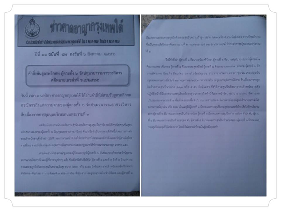วันนี้ (6 ส.ค.56) 9.00 น. ที่ห้องพิจารณาคดีที่ 402 ศาลอาญากรุงเทพใต้ ศาลอ่านคำสั่งกรณี ไต่สวนคําร้องชันสูตรการเสียชีวิต ในคดีที่พนักงาน อัยการฝ่ายคดีอาญากรุงเทพใต้ 4 ยื่นคําร้องขอให้ ศาลไต่สวนชันสูตรการเสียชีวิตของ