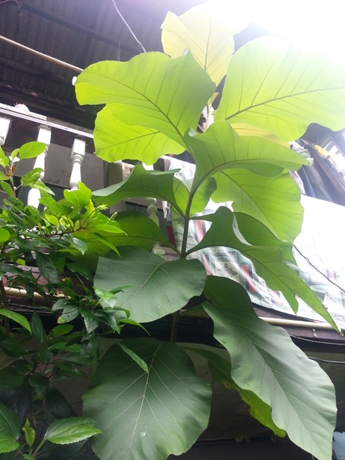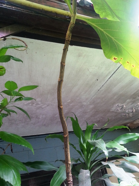 ตอนนี้สูงขึ้นถึงระเบียงบ้านชั้นบนแล้วค่ะ แต่ต้นมันจะลำเล็กๆ ไม่ใหญ่ (แต่ใบใหญ่)