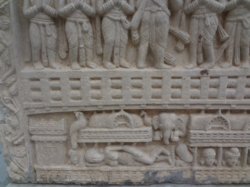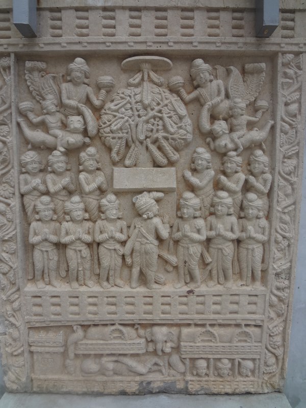 ภาพแกะสลักหินทรายนี้เป็นภาพเทวดาประชุมกันทูลเชิญพระโพธิ์สัตว์บนแท่นว่างใต้ต้นโพธิ์จากสวรรค์ชั้นดุสิต จุติลงมาบังเกิดในพระครรภ์ของพระนางสิริมหามายาซึ่งกำลังบรรทมท่าสีหไสยาสน์อันเป็นท่านอนของผู้ปฏิบัติธรรมที่มีจิตสมบูรณ์ ท่ามกลางเทวดาชายหญิงคอยปรนนิบัติพัดวีชิดพระบาท (ภาพและคำบรรยายภาพจาก สวนโมกข์ฯ กรุงเทพ)