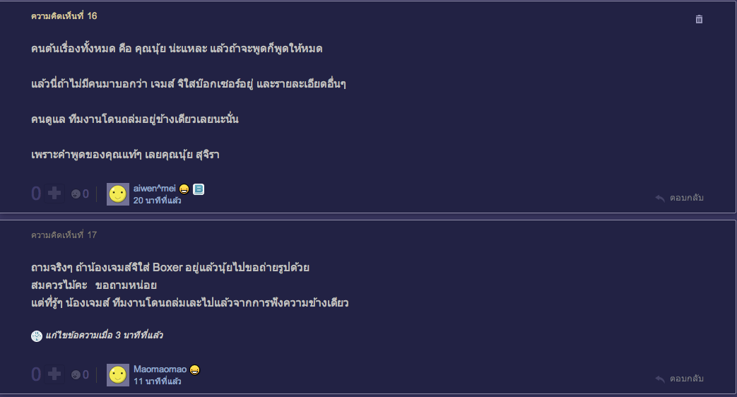 คือ อยากจะถามกลับคนที่ตั้งคำถามว่า แล้วทำไมถ่ายแค่ท่อนบ่นไม่ได้? ไม่ได้เป็นแฟนคลับ เจมส์ จิ ส่วนตัวเข้าใจความรู้สึก นุ้ย สุจิรา แต่ไม่เข้าใจความคิดเห็นของคนที่ค