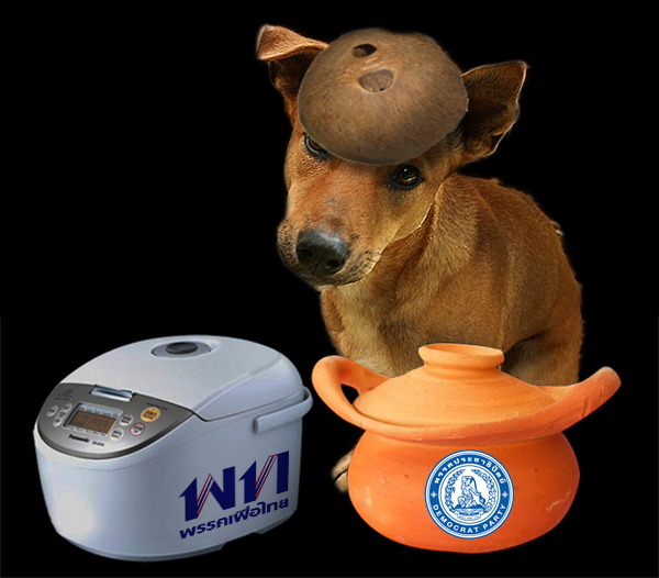 เพราะหม้อหุงข้าว คืออุปกรณ์การทำข้าวสารให้กลายเป็นข้าวสุกผ่านกรรมวิธีการต้มด้วยความร้อนของน้ำเดือด ส่วนระบอบทักษิณ คือการทำให้ข้าวสารกลายเป็นข้าวเน่าคาโกดัง ผ่านกรรมวิธีต้มชาวนาด้วยนโยบายจำนำข้าวทุกเ
