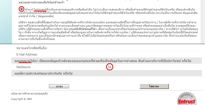 "ข้าพเจ้าไม่ประสงค์ที่จะรับเอกสารเสนอบริการหรือสินค้าอื่น ไม่ว่าจะเป็นการเสนอบริการ หรือสินค้าของบริษัทคู่ค้าของบริษัทในเครือ หรือองค์กรอื่นใด รวมทั้งไม่ยินยอมให้บริษัทในเครือเปิดเผยข้อมูลส่วนตัวของข้าพเจ้าให้แก่บริษัทคู่ค้าของบริษัทในเครือ หรือองค์กรอื่นใด (ยกเว้นเป็นการเปิดเผย ข้อมูลเครดิตแห่งชาติ จำกัด / ข้อมูลเครดิต)"