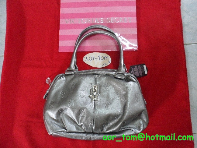 กระเป๋า VICTORIA’S SECRET สีบรอนซ์เงิน สกรีนลาย VS ทั่วกระเป๋า ด้านหน้าแต่งโลหะรูปดาวล้อมคริสตัลเก๋ๆ น่ารักๆ ขนาดโดยประมาณ 12” x 9”