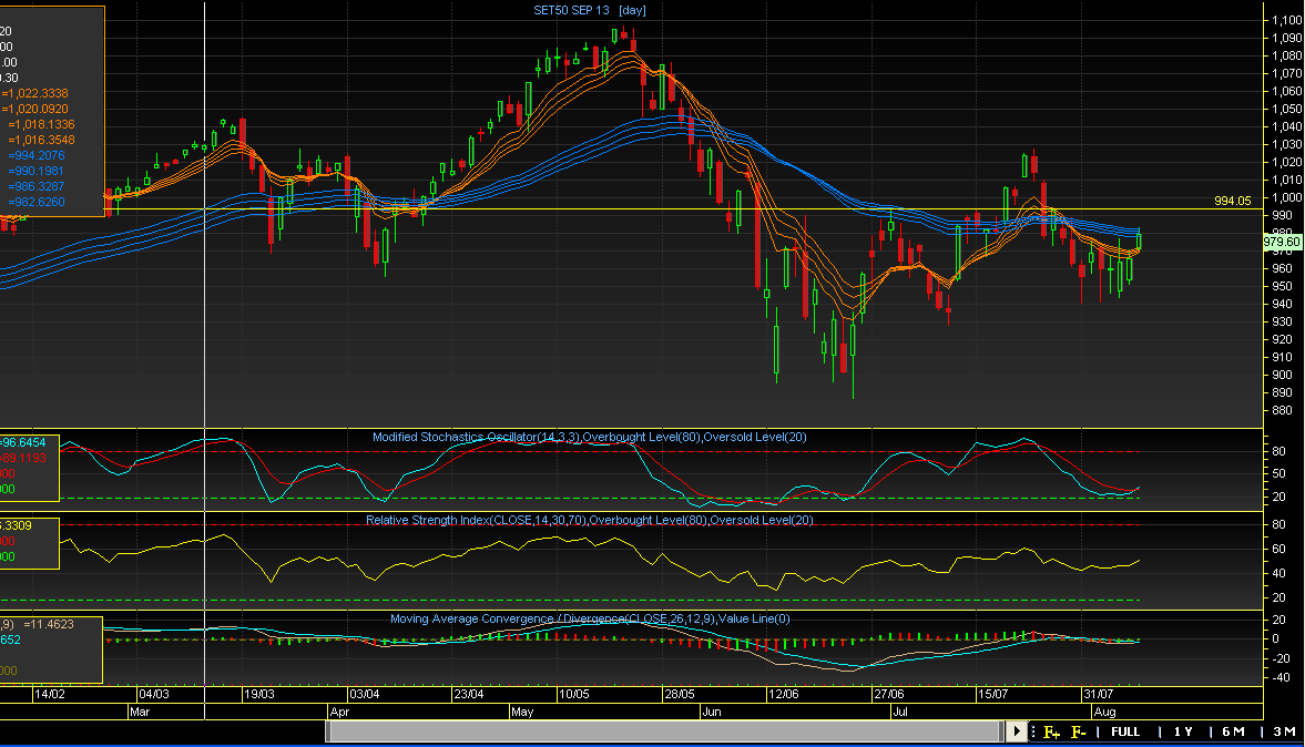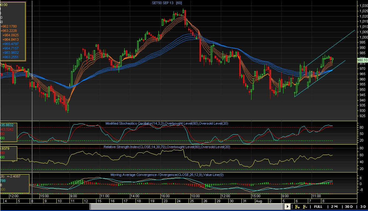 ปัจจัยทางเทคนิค TF day เขียวมาแล้ว 4 แท่ง แถมแท่งเมื่อวานปิดเหนือ 980 ขึ้นมาได้ ค่อนข้าง Confirm Long Signal แต่คาดว่าบริเวณแนวต้าน 994,995 น่าจะเกิดแรงขาย ออกมา วันนี้ แท่งที่ 5 น่าจะมีโอกาสที่จะปิดแท่งแดง