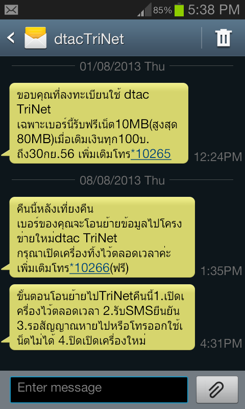 Dtacส่งข้อความมาว่าจะเปลี่ยนเป็นTrinetให้หลังเที่ยงคืน แต่ตื่นมาตอนเช้าเห็นโทรศัพท์แบตหมดพอเอาไปชาร์ตแล้วเปิดเครื่อง เครื่องมีสัญญาณครับแต่เป็นของTruemoveH(บางครั้งก็เปลี่ยนเป็นDtacบ้าง) และโทรเข้า-ออกไม่ได้ครับ