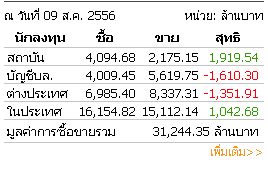 เว็บไซต์ตลาดหลักทรัพย์แห่งประเทศไทย รายงานสรุปการซื้อขายหลักทรัพย์ โดยแบ่ง ตามประเภทนักลงทุน ประจำวันที่ 4 มิถุนายน 2557 ดังนี้ กลุ่ม ปริมาณซื้อ % ปริมาณขาย % สุทธิ (ลบ.) (ลบ.) (ลบ.) นักลงทุนสถาบัน 4