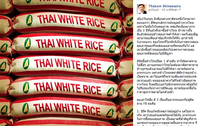 อิรัคซื้อข้าวไทยปีละ 1 ล้านตัน ทำให้ตลาดหายไปดื้อๆ เขาบอกผมว่าไทยไม่ต้องมาตัดราคาขายข้าวถูกๆแล้วเอาของไม่ดีให้เขา เขาพร้อมจ่าย premium เพราะข้าวไทยรสชาติดีกว่าของข้าวเวียดนาม เขาไม่แคร์ที่จะจ่ายเพิ่มเพราะประเทศเขารวยแล้ว คนของเขาควรได้กินข้าวมีคุณภาพจากไทย ก็เลยรีบบอกไปยังกระทรวงพาณิชย์ให้ไปรับรองกับทางการอิรัคเลย เขาพร้อมจะซื้อในราคาสูงกว่าตลาดโลกด้วยซ้ำ