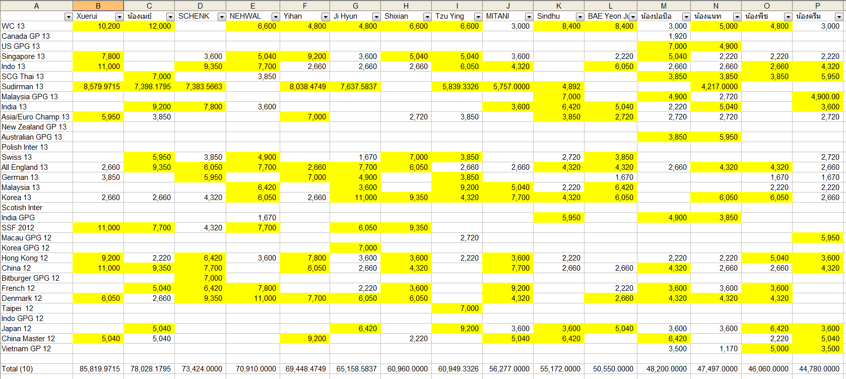 การคิดอันดับคะแนนแบดมินตัน จะคิดเฉพาะผลงานในรอบ 52 สัปดาห์หลังสุด (คล้ายกับอันดับโลกของเทนนิส) แล้วจะนับเฉพาะสิบรายการที่ผู้เล่นแต่ละคนได้คะแนนสูงสุดครับ