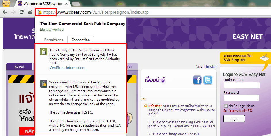กำลังจะเข้าไปทำ internet banking ตามปกติค่ะ แต่ว่ามันผิดปกติจากเดิมตรงที่ https:// ปกติมันจะเป็นแถบสีเขียว (ใช้ chrome)