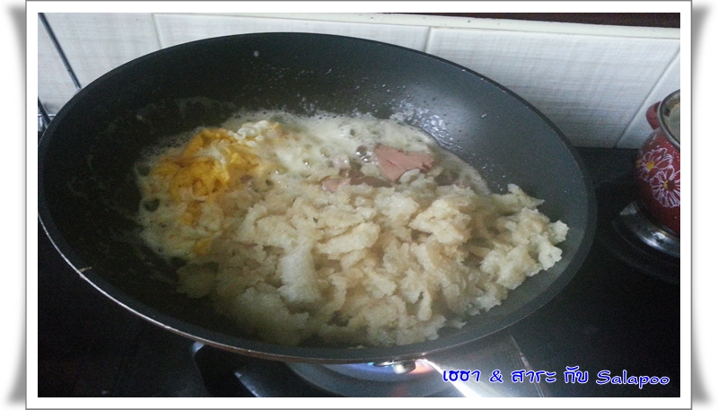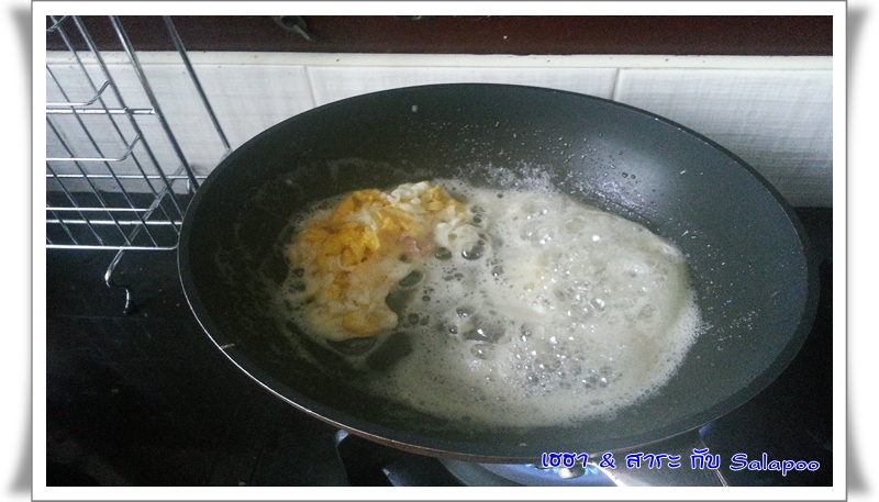 ใส่เครื่องปรุงสำหรับการผัดทั่วไป แล้วตอกไข่ใส่ลงไปอีก 1 ฟอง กะให้เป็นตัวประสาน