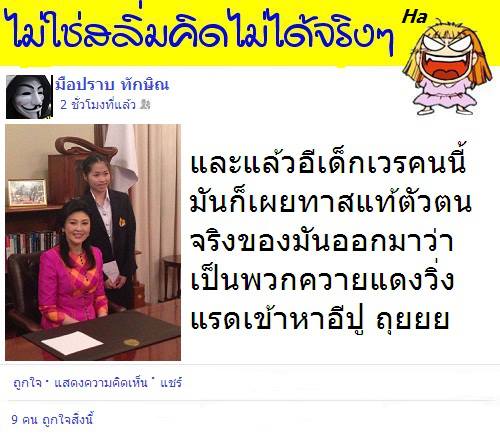 มันแสดงถึงต่อมแยกแยะท่าน วิปลาส อย่างแรงส์ ก่อนอื่น ผมขอญาติ ตบกะโหลกท่านเบาๆและบอกว่า การที่บุคคลใดจะเข้าพบนายกไม่จำเป็นต้องเป็นเสื้อแดง เสมอไปหรอกครับ ประการต่อมาท่านนายกจะให้ผู้เข้าพบเพื่อเป็นเกียรติแก่ผู้ทำคุณประโยชน์และชื่อเสียงให้แก่ประเทศในกรณีพิเศษบางโอกาศครับ มาถึงตงนี้ผมขอ ตบกระบานท่านเบาๆ และถามว่า ถ้าลูกหลานของท่านทำใด้เหมือนน้องเมย์ ท่านจะให้ เข้าพบนายกเงา หรือ นายกจริงที่เลือกจาก ปชช ครับ เอ อย่าบอกนะให้เข้าพบ อ้ายลิ้ม (ขอญาดขรรม 5555) ครับ สวัสดี