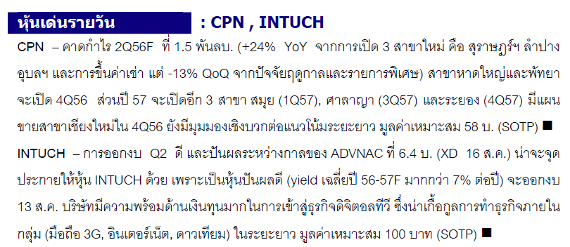 หุ้นเด่นรายวัน : CPN , INTUCH