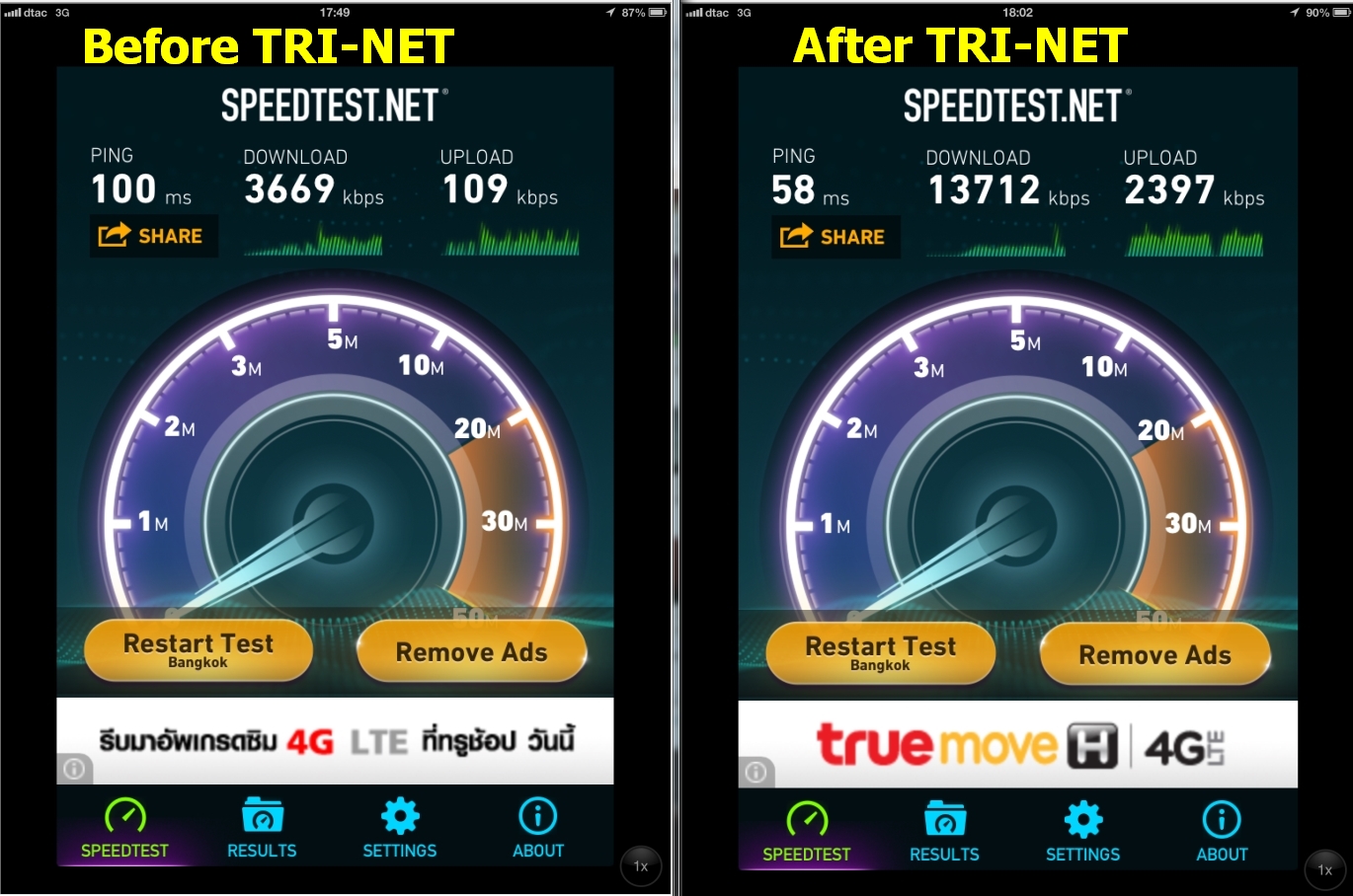 ตามรูปครับ BEFORE, AFTER (host: dtac trinet) นั่ง capture ก่อนย้ายเข้า Tri-Net แบบทันที ที่ dtac hall แฟชั่นไอซ์แลนด์ โทรเข้า โทรออกได้ปกติ สัญญาณ มีขีดเพิ่มขึ้น (ปกติ อยู่ในบ้าน dtac จะมีแค่ ขีดเดียว และ เป็น E แต่นี่ มี 4 ขีด และเป็น 3G สถานที่เดิมๆ)