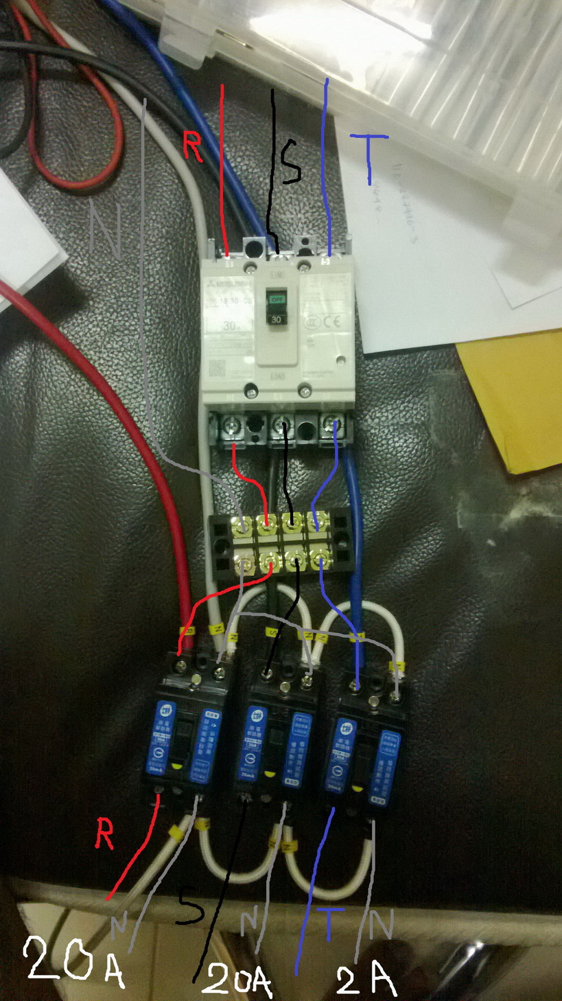 ครับจากรูปผมต่อไฟสามเฟส ผ่านเบรคเกอร์ 30 A โดยดึงไฟไปใช้ 3 ส่วนตามรูป