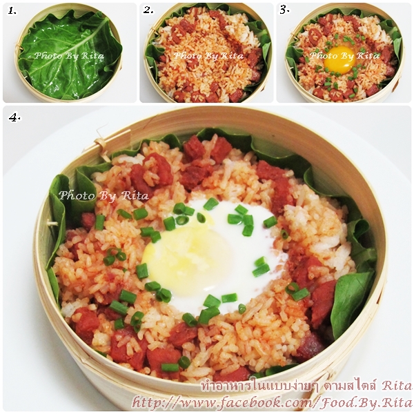 พอดีอ่านการ์ตูน Hana China มีข้าวผัดนึ่ง เราเลยคิดว่าเอาเข่งมาเป็นภาชนะบ้างคงทำให้เจริญอาหารขึ้น ก็เลยเป็นที่มาของเมนูนี้ค่ะ