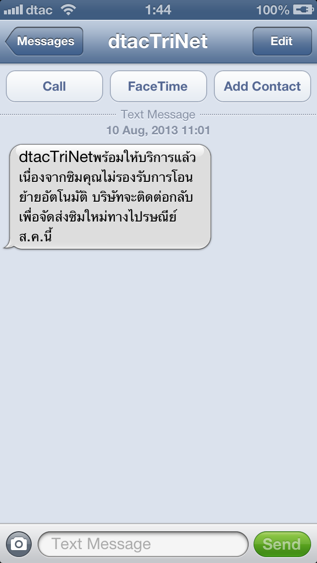 จนถึงวันนี้ก็เกือมสี่เดือน แล้วผมก็ได้รับ sms ที่มีข้อความบอกว่า Dtac Trinet พร้อมให้บริการแล้ว แต่ ซิมของผมยังไม่รองรับการย้ายค่ายอัตโนมัติ (ใครจะไปรู้ล่ะ iphone 5 ก็ต้องเปลี่ยนซิม) บริษัทจะติดต่อกลับเพื่อจะจัดส่ง sim มาให้ผมที่บ้านภายในเดือน สิงหาคม นี้...