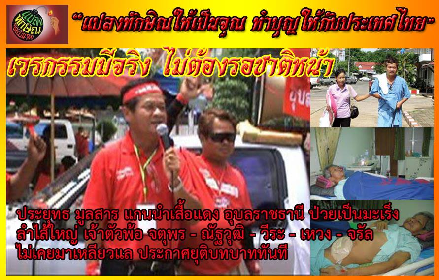 คนเสื้อแดง ในความเป็นจริง ไม่ใส่ใจ และห่วงใยต่อเพื่อนพ้องที่ร่วมเป็นร่วมตายมาด้วยกัน เพียงเพราะผลประโยชน์ ขอแถลงการณ์ประนามคนที่เห็นผลประโยชน์มากกว่าอุดมการณ์และความถูกต้องครับ
