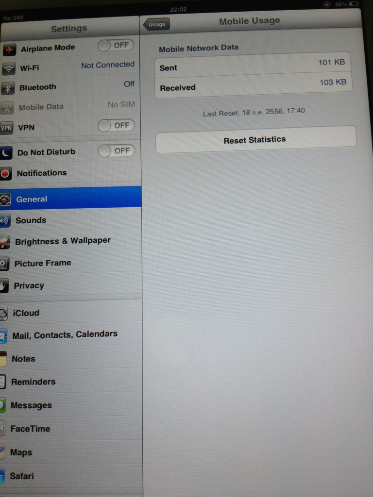 -iPadทำการresetเมื่อ18 ก.ค. 56เวลา17.40น. ปัจจุบันใช้ดาต้าไปทั้งสิ้น 204KB ซึ่งที่มันน้อยเกิดจากซิมมันเสียตั้งแต่วันที่18 ผมจึงถอดเอาซิมออกมาเลย