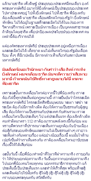 มันเดือดร้อนอะไรนักหนา กับคำว่า เสือ สิงห์ กระทิง ยิ่งลักษณ์ ผมจะเตือน ธาริต มันจะตีความว่าเสียหายมากนี่ ถ้าแรดมันใช้สิทธิ์ทางกฎหมายได้นี่ แรดจะฟ้องธาริต โอ้คุณมาร์ค คุณช่างไร้เดียงสาจริงๆ เชื่อแล้ว