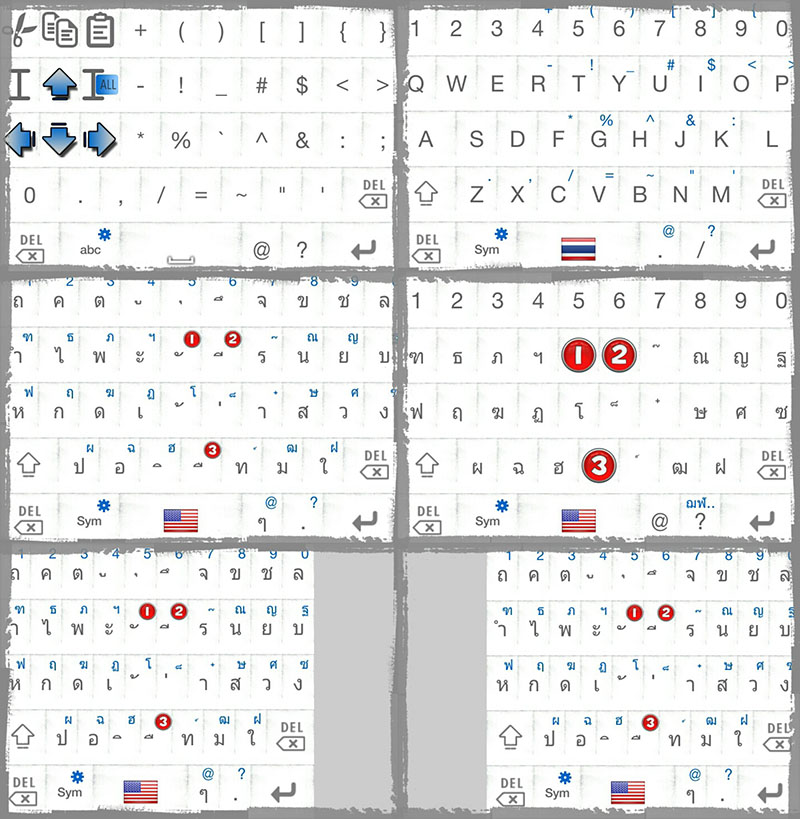 อีกอย่างดูๆแล้วตัวเลขในหน้า Symbols มันซ้ำทั้งหน้า ภาษาไทยแล้วก็ภาษาอังกฤษเลยหาอะไรมาใส่แทน คิดไปคิดมา Navigate keys เป็นตัวเลือกที่ดี เพราะบางที พิมพ์ผิดจะไปแก้ จิ้มเท่าไหร่ก็ไม่โดนตรงที่จะแก้ แถมบางทีจะระบายสี copy ก็จำไม่ได้ว่าจะกดค้างดี หรือจะ double tap ดี เลยทำปุ่ม Select กับ Select All มาด้วยเลย.. ^^.