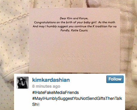 แต่หลังจากบทสัมภาษณ์นี้เผยแพร่ออกไป คิมก็แก้เผ็ดด้วยการโพสต์ภาพที่เธอถ่ายชุดเด็กกับข้อความแสดงความยินดีของเคที พร้อมกับเขียนแฮชแทค (#) ว่าเกลียดเพื่อนสื่อจอมปลอม ขอแนะนำว่าอย่าคิดส่งของขวัญแล้วมาด่าลับหลัง