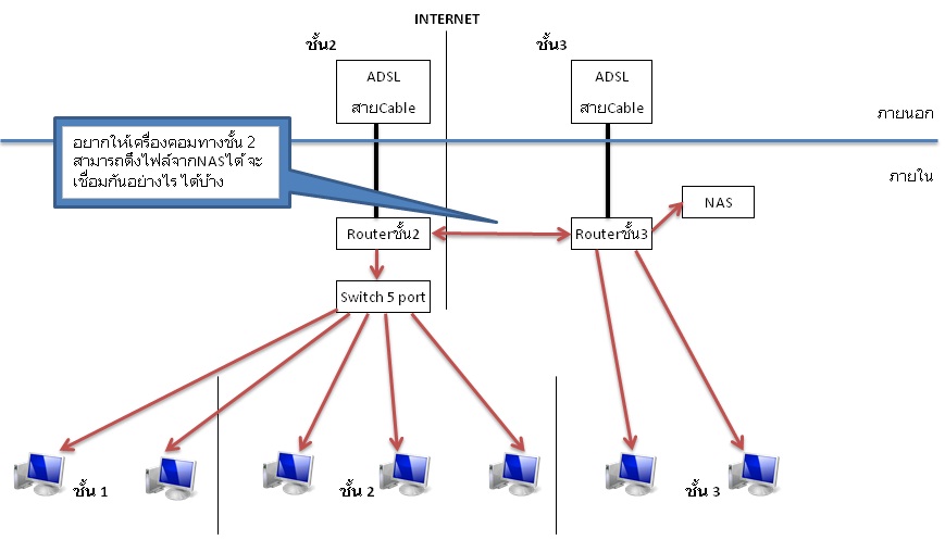 ที่บ้านแยกกันใช้อินเตอร์เน็ตระหว่างชั้น2กับชั้น3 ถ้าอยากให้ชั้น2สามารถดึงไฟล์จากNASที่ชั้น3ได้ ต้องทำอย่างไรครับ