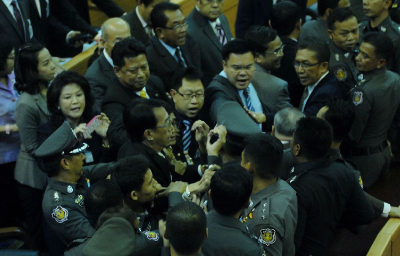 ทั้งนี้ นายกุลเดช พัวพัฒนกุล ส.ส.อุทัยธานี ปชป. เข้าไปผลักหน้าเจ้าหน้าที่ตำรวจ และใช้มือค้ำคอ จนเกิดความชุลมุนวุ่นวายทำให้เจ้าหน้าที่ตำรวจพยายามล็อคแขนนายกุลเดช เพื่อพาตัวออกจากห้องประชุม สร้างความไม่พอใจแก่ส.ส.ปชป. ที่พยายามกรูเข้ามาช่วยนายกุลเดช โดยนายธานี เทือกสุบรรณ ส.ส.สุราษฎร์ธานี ปชป. ได้วิ่งเข้ามาผลักเจ้าหน้าที่ตำรวจที่ล๊อคตัวนายกุลเดช ทำให้เจ้าหน้าที่เข้ารวบตัวนายธานี เพื่อลากออกจากห้องประชุม แต่นายธานี ขัดขืนต่อสู้ด้วยการใช้มือกดหัวเจ้าหน้าที่ ก่อนที่นายธานี จะสะบัดตัวออกมายืนอยู่ในวงของส.ส.ปชป.ที่พากันต่อว่าเจ้าหน้าที่ว่า "กล้าทำผู้แทนเหรอ" เจ้าหน้าที่จึงหยุดปฏิบัติการ