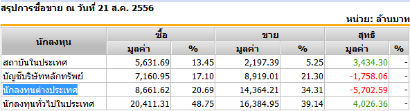 Sinthorn Summary 21/8/2556 : ต่างชาติขายสุทธิ -5,702.59 ลบ.
