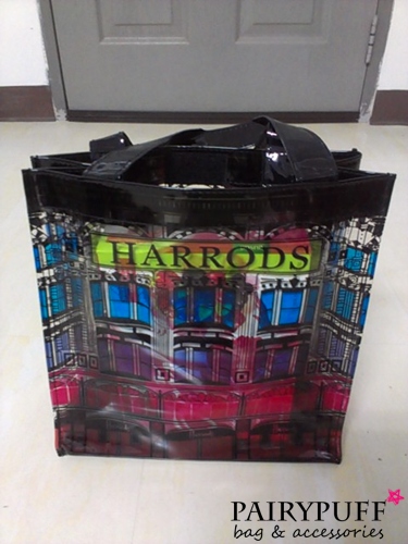 คำว่า'Harrods'ปักด้ายสีเหลืองทอง มีฐานกระเป๋าให้นะคะ