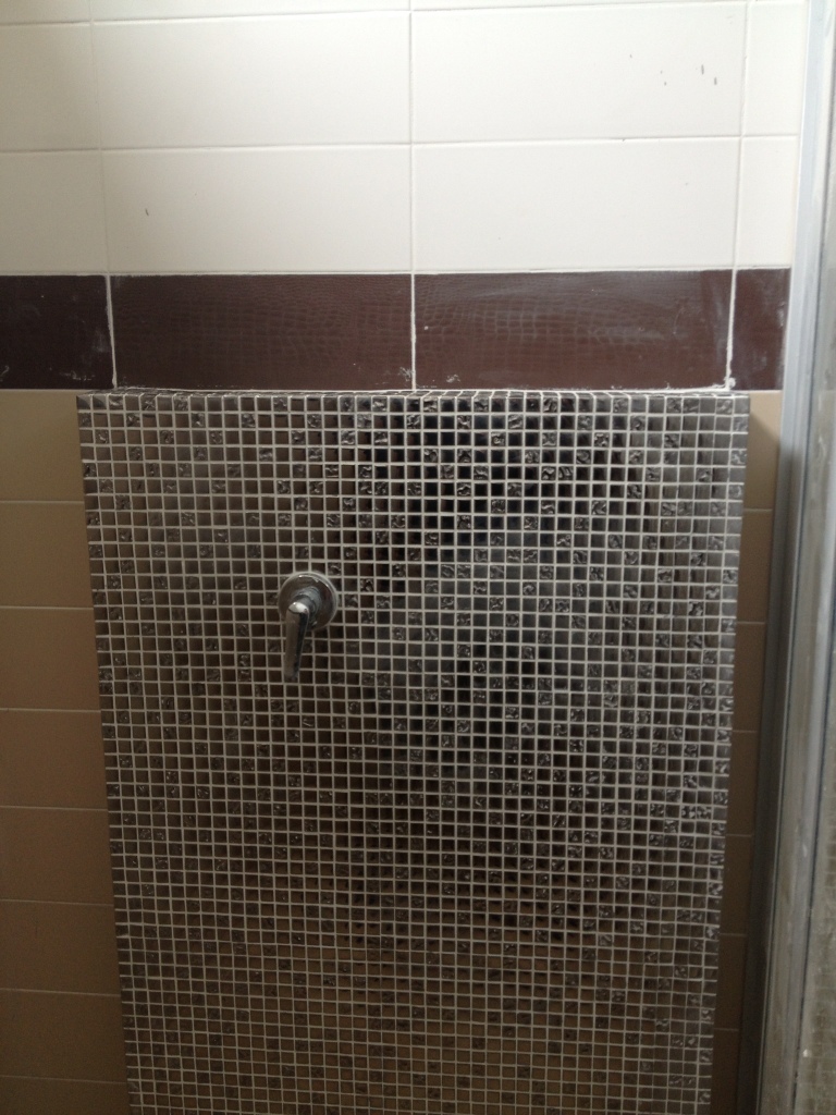 ทำอย่างนี้เลยดีกว่า ก่อผนังยื่นออกมาจากผนังเดิม10ซ.ม. แล้วเอากระเบื้องโมเสคมาติด ทำให้ดูดีไปอีกแบบ แถมยังใช้เป็นที่วางของพวกสบู่ ยาสระผมได้ด้วย