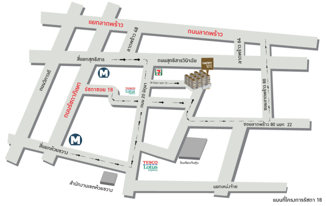 ถ้าขับขี่มาเอง ให้ลองศึกษาเส้นทางเองจากกูเกิ่ลแมพ พิมพ์คำว่า " Happy Condo รัชดา 18 "
