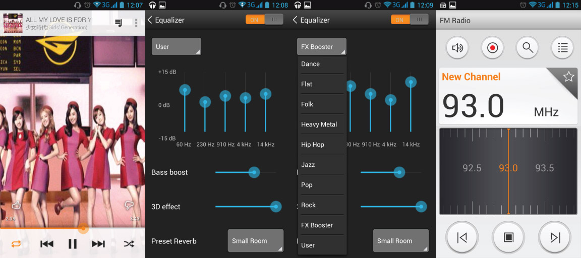 เครื่องเล่นเพลงใช้เดิมๆของ Android ซึ่งก็สวยดีนะ แถมยังปรับแต่งได้เยอะเลยทั้ง EQ แบบสำเร็จรูปและแต่งด้วยตัวเอง และที่เท่มากๆคือวิทยุซึ่งสามารถฟังได้โดยไม่ต้องใส่หูฟัง แถมยังบันทึกเอาใว้ฟังภายหลังได้ด้วย