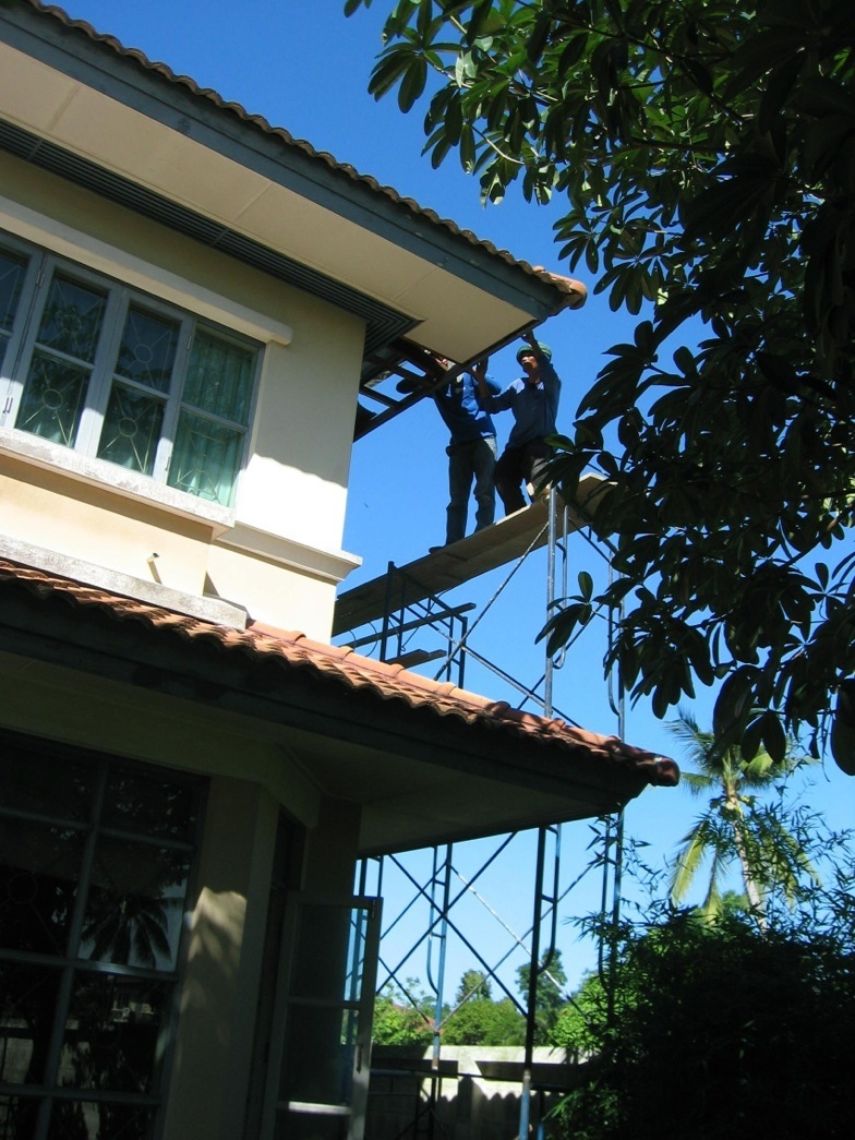 จขกท. : งั้นพี่จ้างนะ เพราะ บ.มั่งคั่งฯบอกว่าไม่มีช่าง ฝนก็ตกทุกวัน ช่างบอกว่าทำชั้น 2 งานเสี่ยงภัย ค่าแรงแพงหน่อย นั่งร้านก็ต้องเช่ามา จ้างแบบเหมารวมของ ไม่ได้เปลี่ยนแต่หลังคา เพราะฝ้าร้าว เชิงชายแตกด้วย